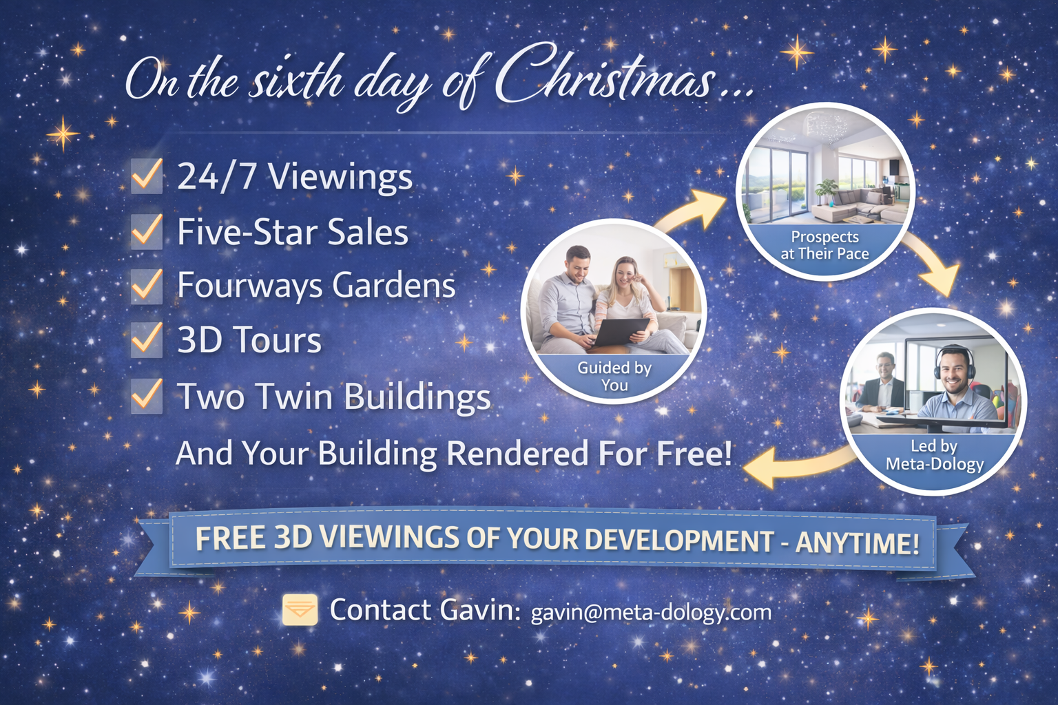 On the sixth day of Christmas, my true love sent to me, 24/7 viewings, five-star sales, Fourways Gardens, 3D tours, two twin buildings, and my building rendered for free.